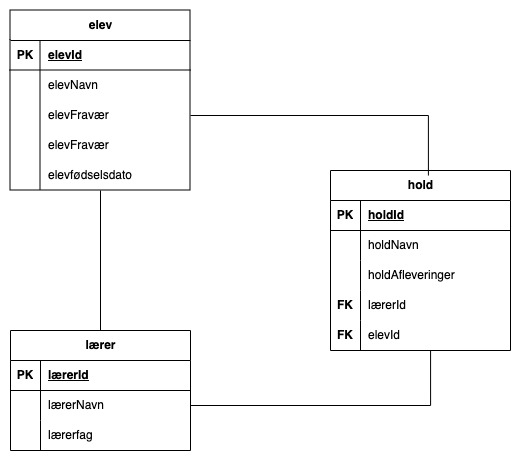 Her er et eksempel på en simpel E/R-model over en database for en skole med entiteterne elev, lærer og hold.