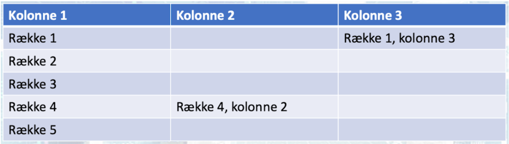 Tabeller er opbygget af rækker og koloner, som du kan se i nedenstående eksempel. Lidt forsimplet kan man sige, at rækkerne er de enkelte enheder, og kolonerne er de egenskaber eller attributter, som hver enhed har.