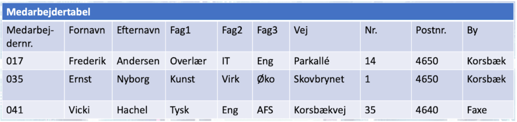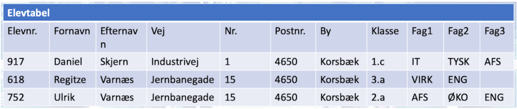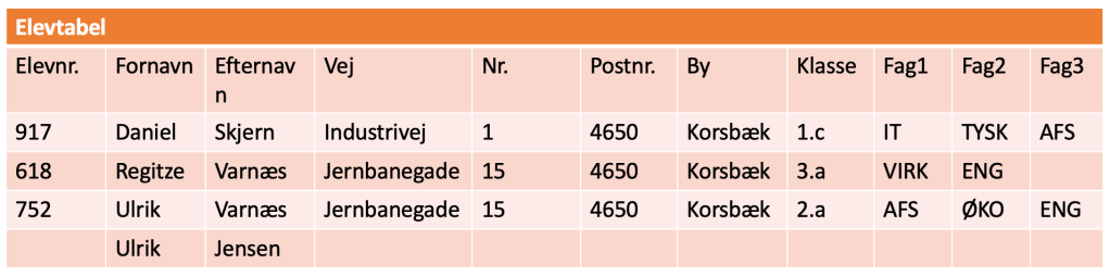- Der kommer en ny dreng ind i Daniel Skjerns klasse. Han hedder Ulrik Jensen. Han bor Branddammen 2 i Korsbæk. Ulrik Jensen skal have de tre fag Virksomhedsøkonomi (virk), Engelsk (eng) og Informatik (IT). Nu er der pludselig to elever med samme fornavn i tabellen – hvorfor er det ikke et problem?