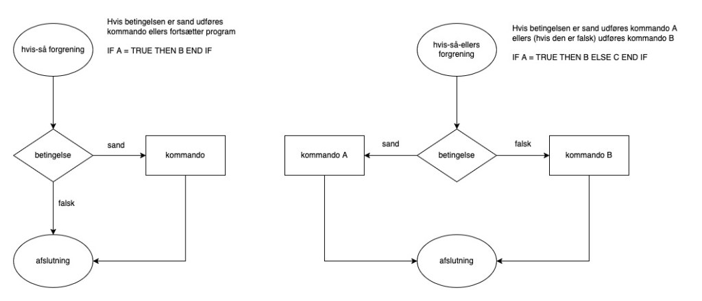 Der er 2 typer forgreninger – Hvis-så (if-then) forgreninger, som udfører en blok kode, hvis betingelsen er sand. – Hvis-så-ellers (if-the-else) forgreninger, som udfører en blok kode, hvis betingelsen er sand, ellers udfører den en anden blok kode. |