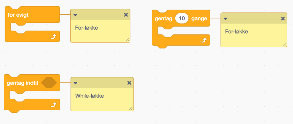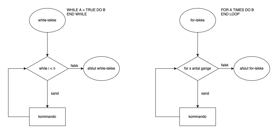 Der er to typer løkker: – For-løkker, som gentager koden et bestemt antal gange. – While-løkker, som gentager koden så længe betingelsen er sand. |
