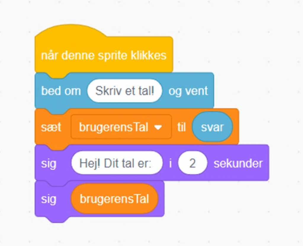 Her er et eksempel fra ‘Katten-efter-musen’ som du kender fra introduktionen til Scratch. Læg mærke til hvordan sætningerne “passer sammen” og hvordan nogle dele kan sættes ind i sætninger og andre ikke kan ift. form.