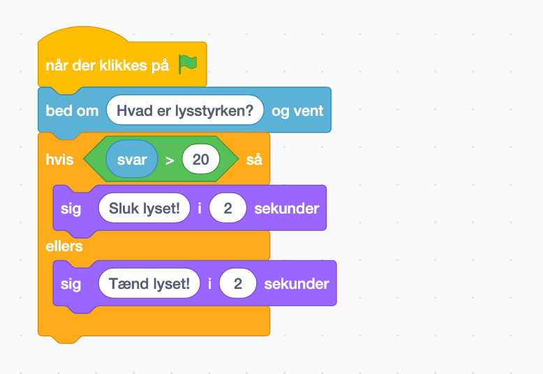 Modificer lysmåler-programmet fra Øvelse i rutediagram 2, så det gemmer svar i en variabel. I kan se det oprindelige program nedenfor. Husk at erklære en ny variabel med et sigende navn, fx lysmåling.