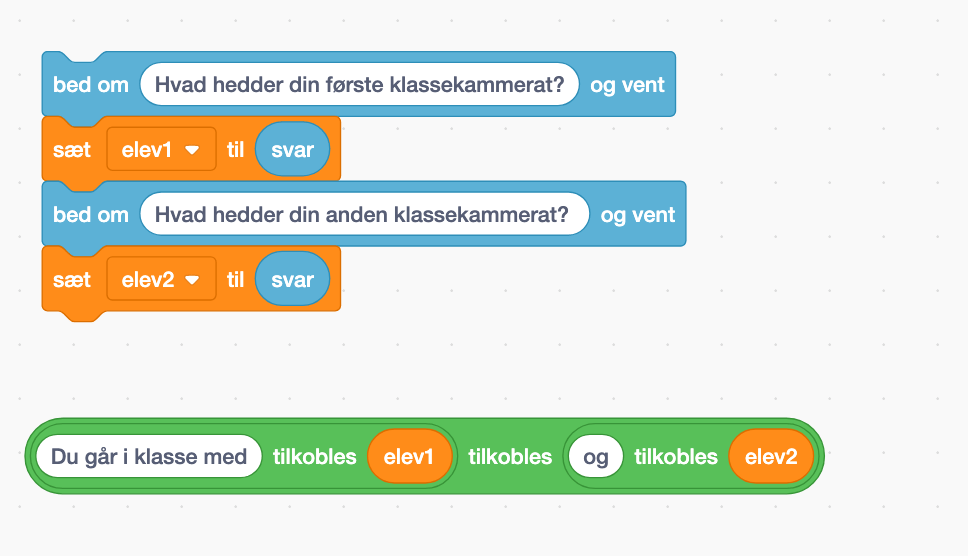 Vær opmærksom på, at hver variabel skal tildeles værdien svar efter hvert spørgsmål (se nedenstående eks.). For at programmet kan lave outputtet “Du går i klasse med “variabel1” og “variabel2”, skal I bruge 3 tilkobles, som I finder under Operatorer (se nedenstående eks.). Vær opmærksom på, at output hermed bliver uden mellemrum. Hvis I vil have mellemrum mellem ordene, skal I bruge flere tilkobles.