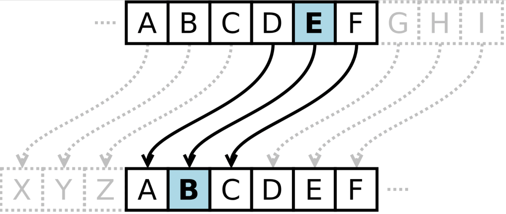 Eksemplet viser et skift på tre pladser, således at et B i klarteksten bliver til et E i chifferteksten.