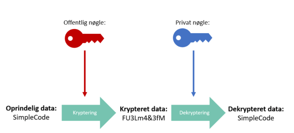 Asymmetrisk kryptering gør brug af flere nøgler. En offentlig nøgle, som er kendt af både afsender og modtager og alle andre, samt to private nøgle, som er forskellige for afsender og modtager.